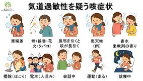 • 誘因:冷たい空気、たばこの煙、ハウスダスト、運動、寒暖差が大きい季節の変わり目などが発作の引き金になります。