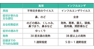 • 発症の仕方:インフルエンザは症状が急激に現れる(全身症状から始まる)のに対し、風邪は喉の痛みや鼻水などからゆっくり始まることが多いです。