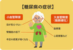 - 視力低下・かすみ:網膜の血管が傷つくため(糖尿病網膜症)。