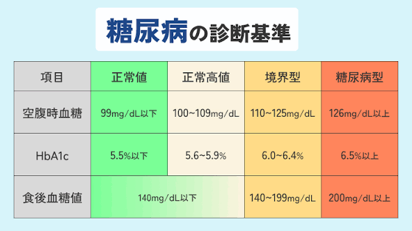 | 糖尿病型 | 6.5% 以上 | 126mg/dL 以上 |